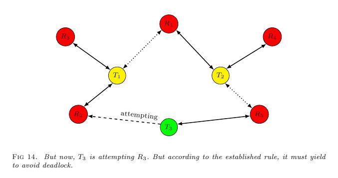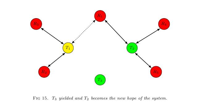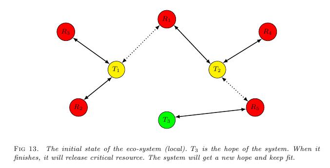 Figure.(13) shows the initial state of the eco-system (local). $T_3$ is the hope of the system. When it finishes, it will release critical resource. The system will get a new hope and keep fit. In Figure.(14), $T_3$ is attempting $R_3$. But according to the established rule, it must yield to avoid deadlock. In Figure.(15), $T_3$ yielded and $T_2$ becomes the new hope of the system.
